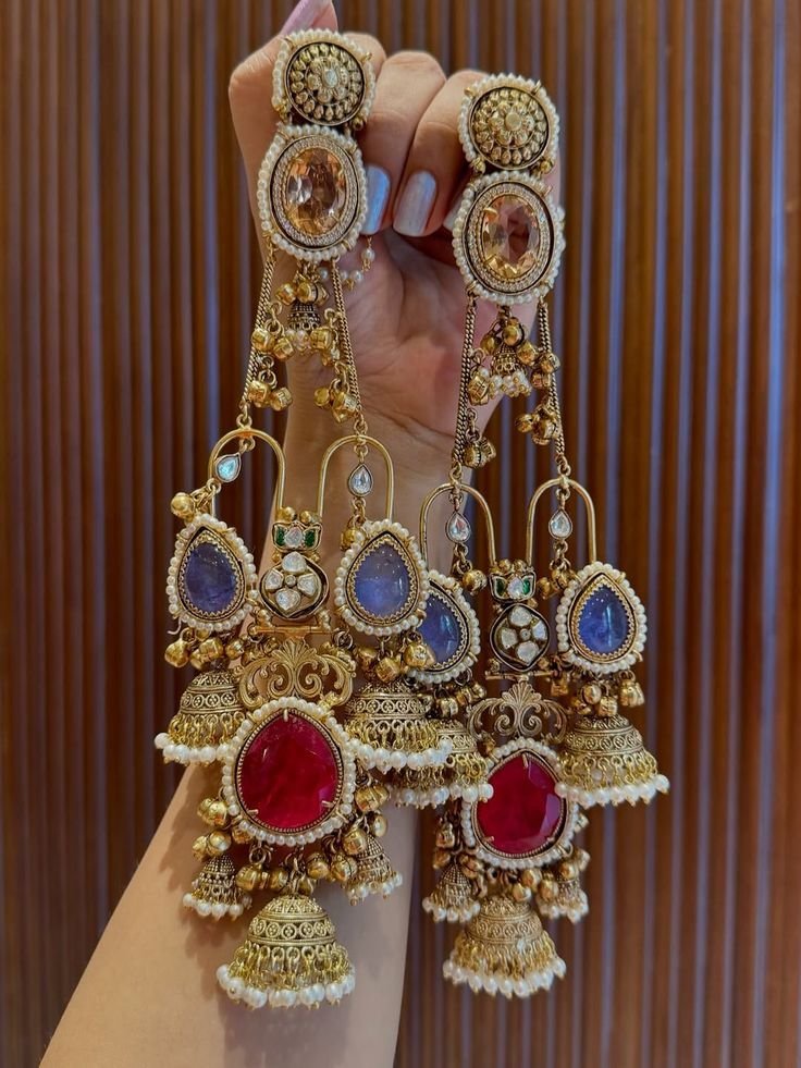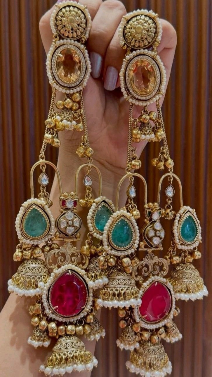 These Navratna Kundan Multi-Layer Long Bridal Jhumka Earrings are a grand expression of traditional Indian craftsmanship. Designed with rich navratna stones, kundan detailing, and layered long drops finished with ornate jhumkas and pearl accents, these earrings are perfect for brides and festive occasions that call for a royal statement.