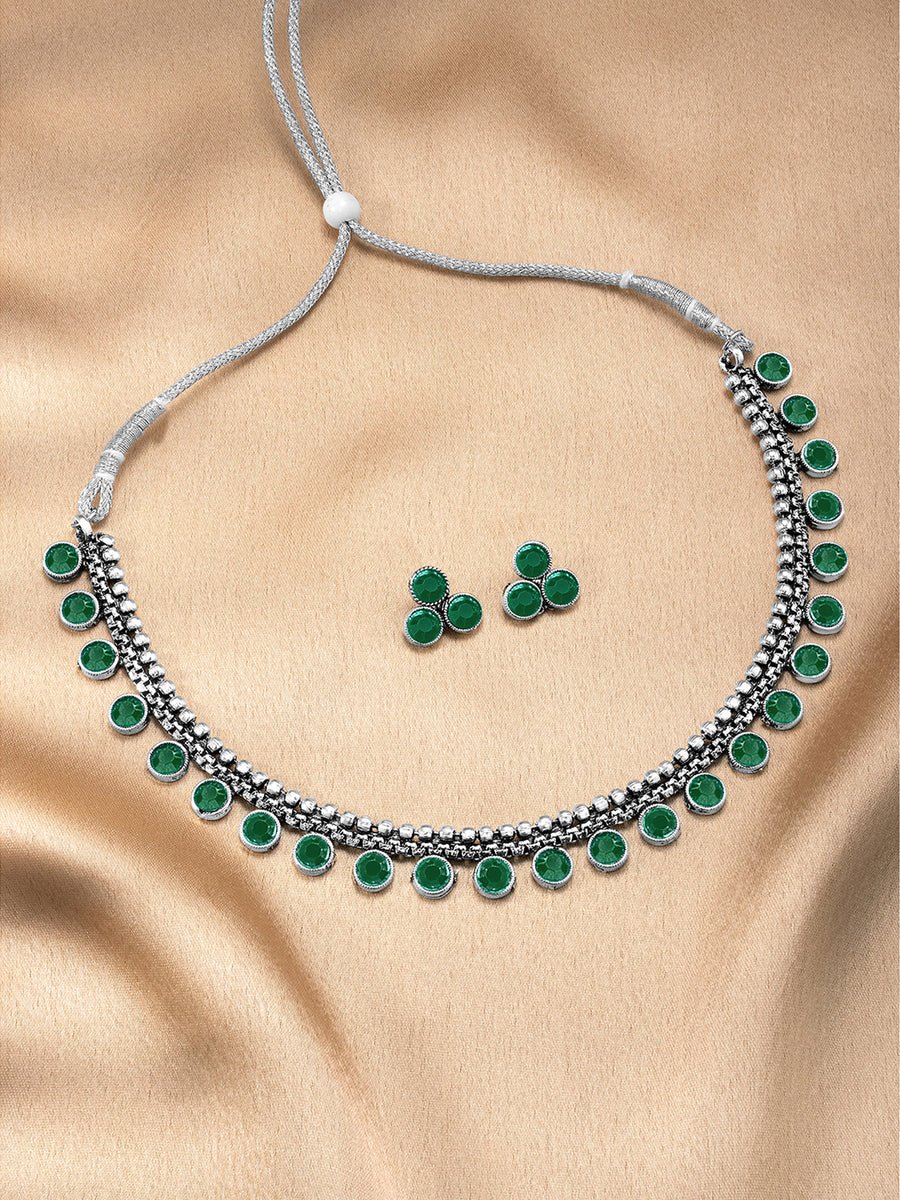 The Minimal Aura Oxidized Necklace Set in silver with green accents is designed for effortless everyday elegance. Featuring a clean, modern silhouette with subtle oxidized detailing, this set adds a calm, graceful charm to both ethnic and fusion outfits.