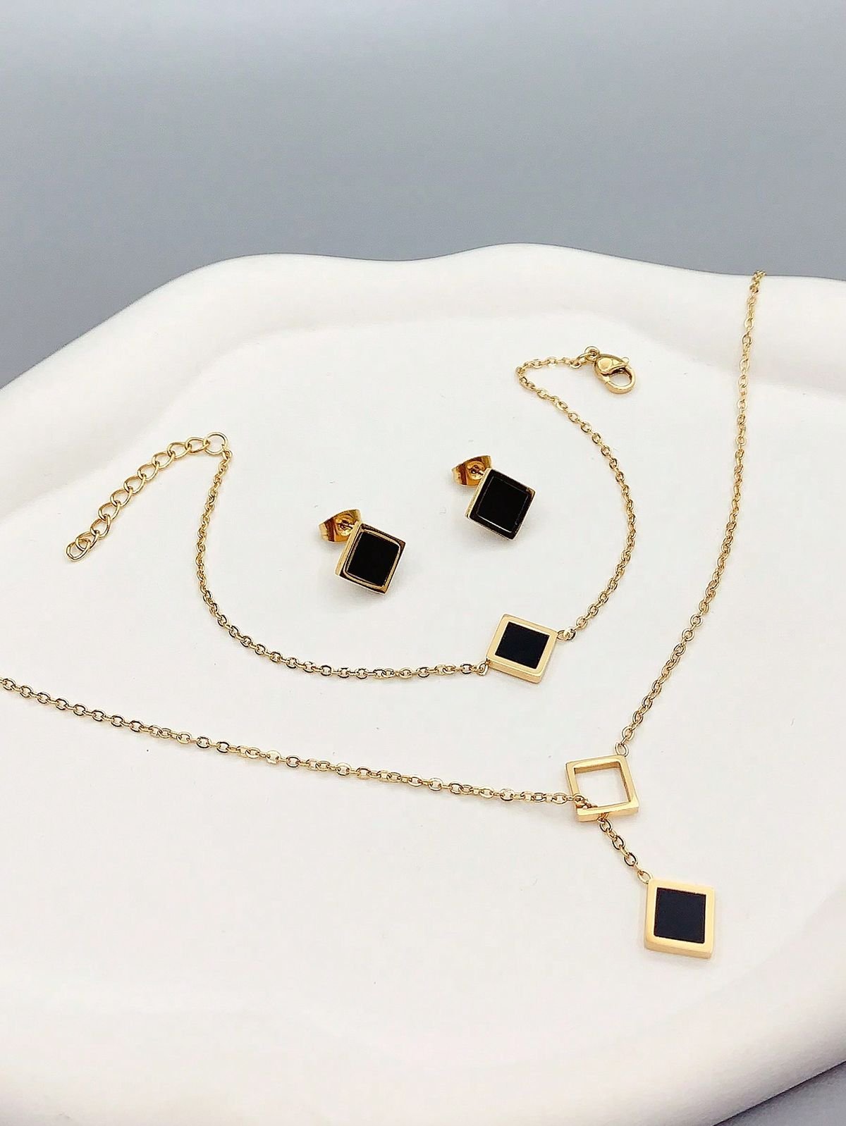 Be the first to review “Women’s Square Black Shell Stainless Steel Necklace Bracelet Earrings”